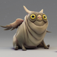 This image appears to be a digital artwork or illustration of an owl creature with some characteristics of a fantasy animal. It has large, round eyes and is holding a red object that could be interpreted as a ball or sphere. The background is simple and does not distract from the subject. The overall impression is whimsical and imaginative, fitting within the realm of fantasy art.