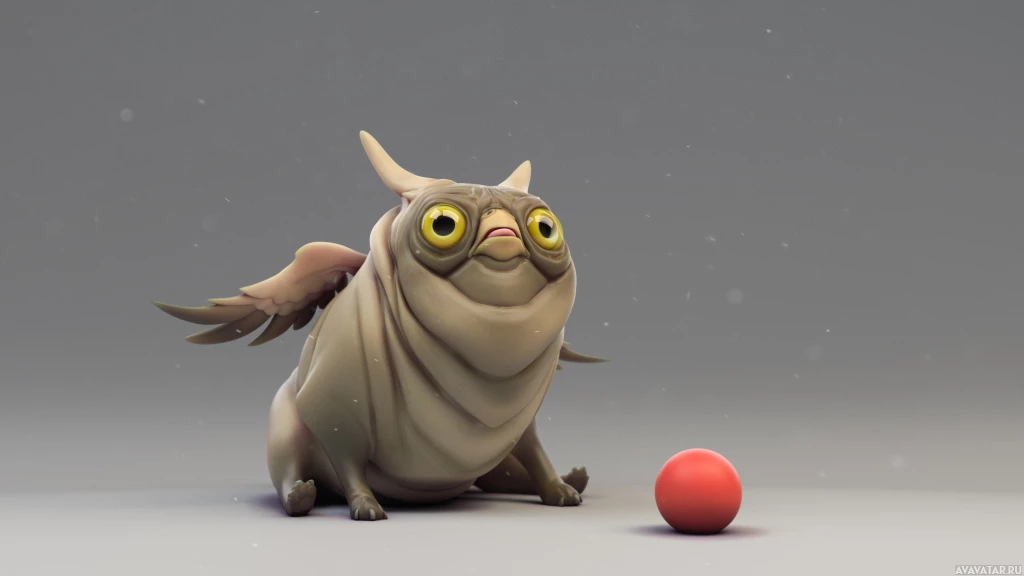 Это изображение, по-видимому, представляет собой цифровую иллюстрацию совы с некоторыми чертами фантастического животного. У совы большие круглые глаза, а в руках она держит красный предмет, который можно интерпретировать как шар. Фон простой и не отвлекает от объекта съемки. Общее впечатление - причудливое и образное, вписывающееся в сферу фантастического искусства.