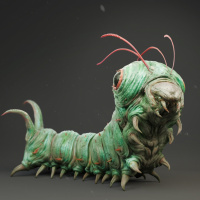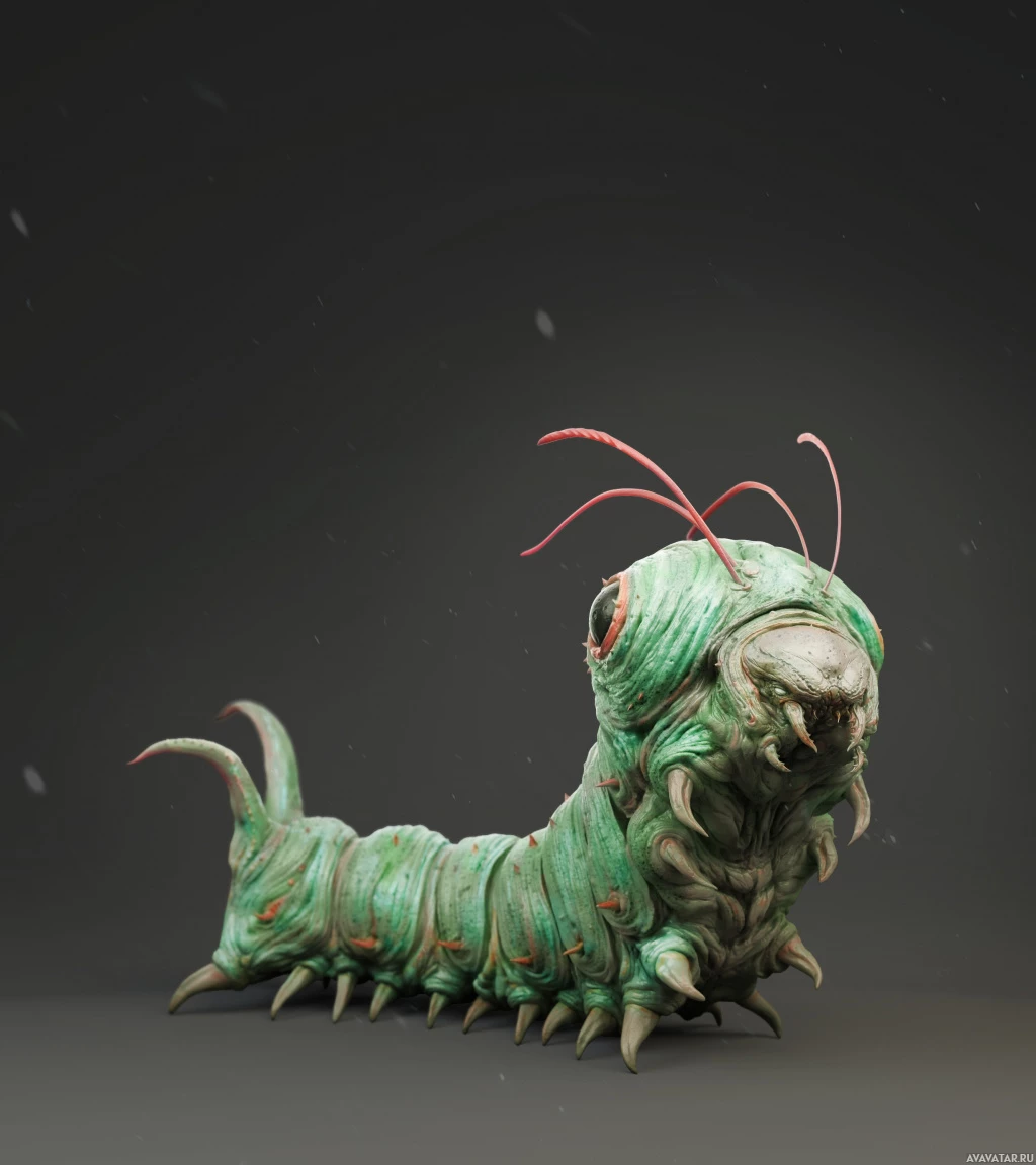 The image shows a creature that resembles a Pokémon. It has a green, segmented body with red spots and