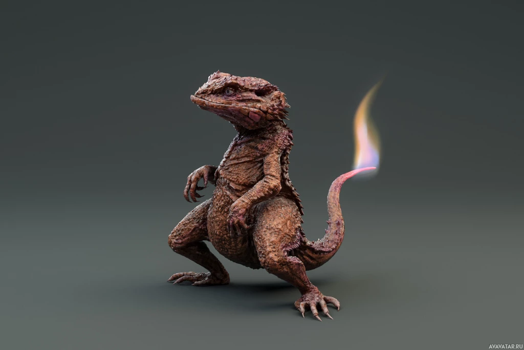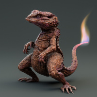 The image shows a creature that resembles Charmander, a fictional Pokémon character. It's depicted with a more realistic appearance than its typical cartoon-like representation in the Pokémon series. The creature has a scaly body,
