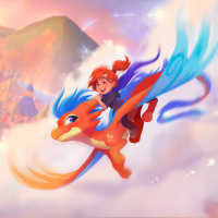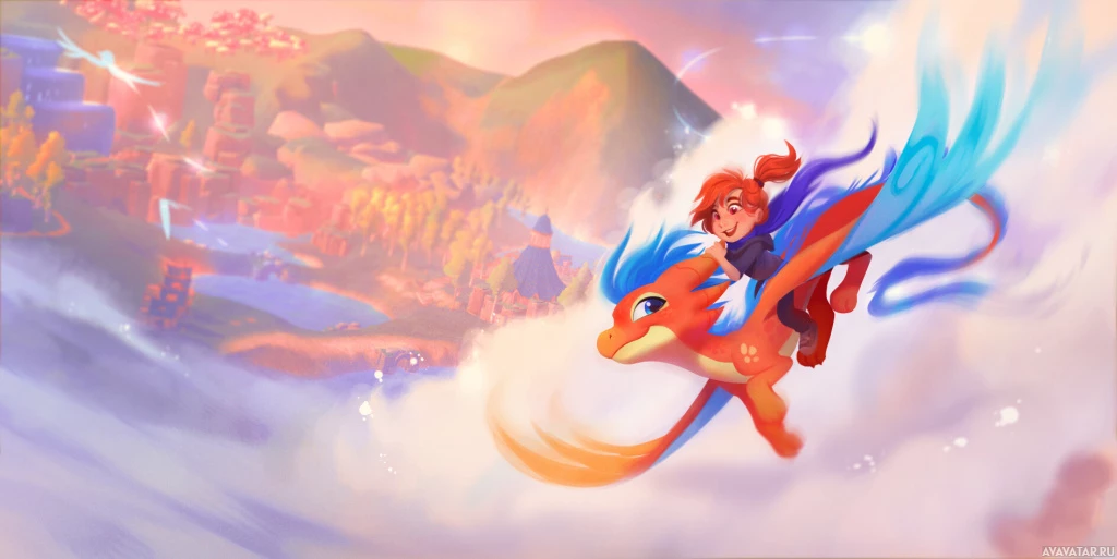 На картинке изображен рыжеволосый персонаж верхом на спине дракона. Этот стиль обычно ассоциируется с детскими медиа и играми, такими как "Покемоны", где персонажи часто ездят верхом на спинах различных существ, известных как "мон". Иллюстрации яркие и красочные, что характерно для подобного рода фэнтезийного контента, ориентированного на молодую аудиторию.