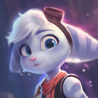a red scarf and has a serious or contemplative expression on its face. In the background, there are stars that give the impression of