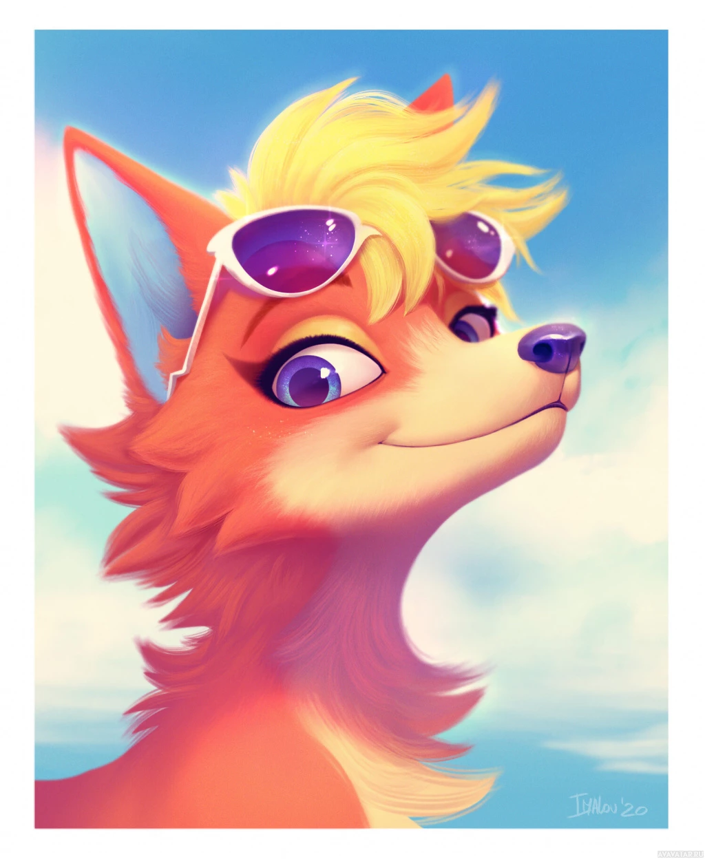 expressive eyes and the ability to wear sunglasses. It also appears to be smiling or laughing, which adds a friendly and approachable vibe to the character. The background is simple with