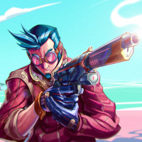 animated character that appears to be a man with striking blue hair and an interesting design of glasses. He is wearing a red jacket over a pink shirt and has