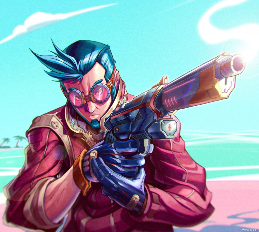 a confident expression on his face. In the character's hand, there is a futuristic-