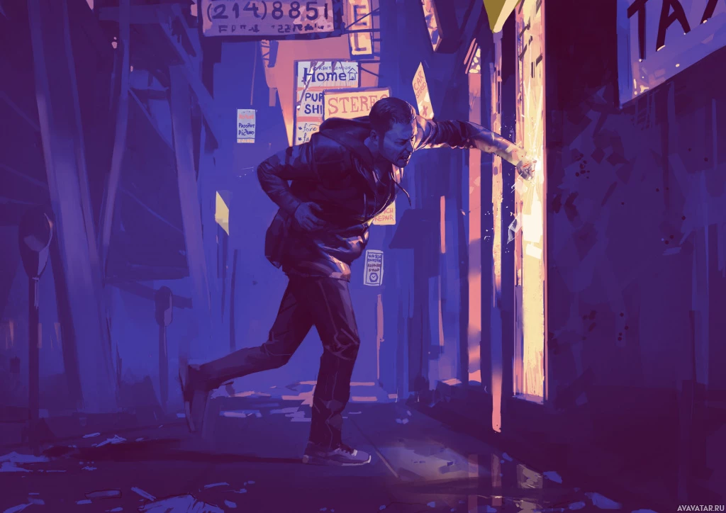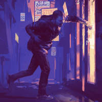dark clothing and is running along the street, with his head turned as if looking back or observing something. In the background, there are signs and lights, suggesting this might be
