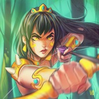 dark hair and is wearing armor with a yellow and black color scheme, along with a helmet that features a crest on top. Her expression conveys determination or focus as she aims at the target in front of her. The background suggests