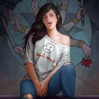 casual attire, including a graphic t-shirt and jeans, and there are elements in the background suggesting a fantasy or mythological setting, such as a star shape with what looks like hands reaching out from its center. The overall tone of the image seems dramatic and somewhat contemplative.