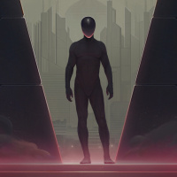 a silhouette of a man walking towards a large, imposing structure or gateway. The background has an industrial or
