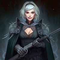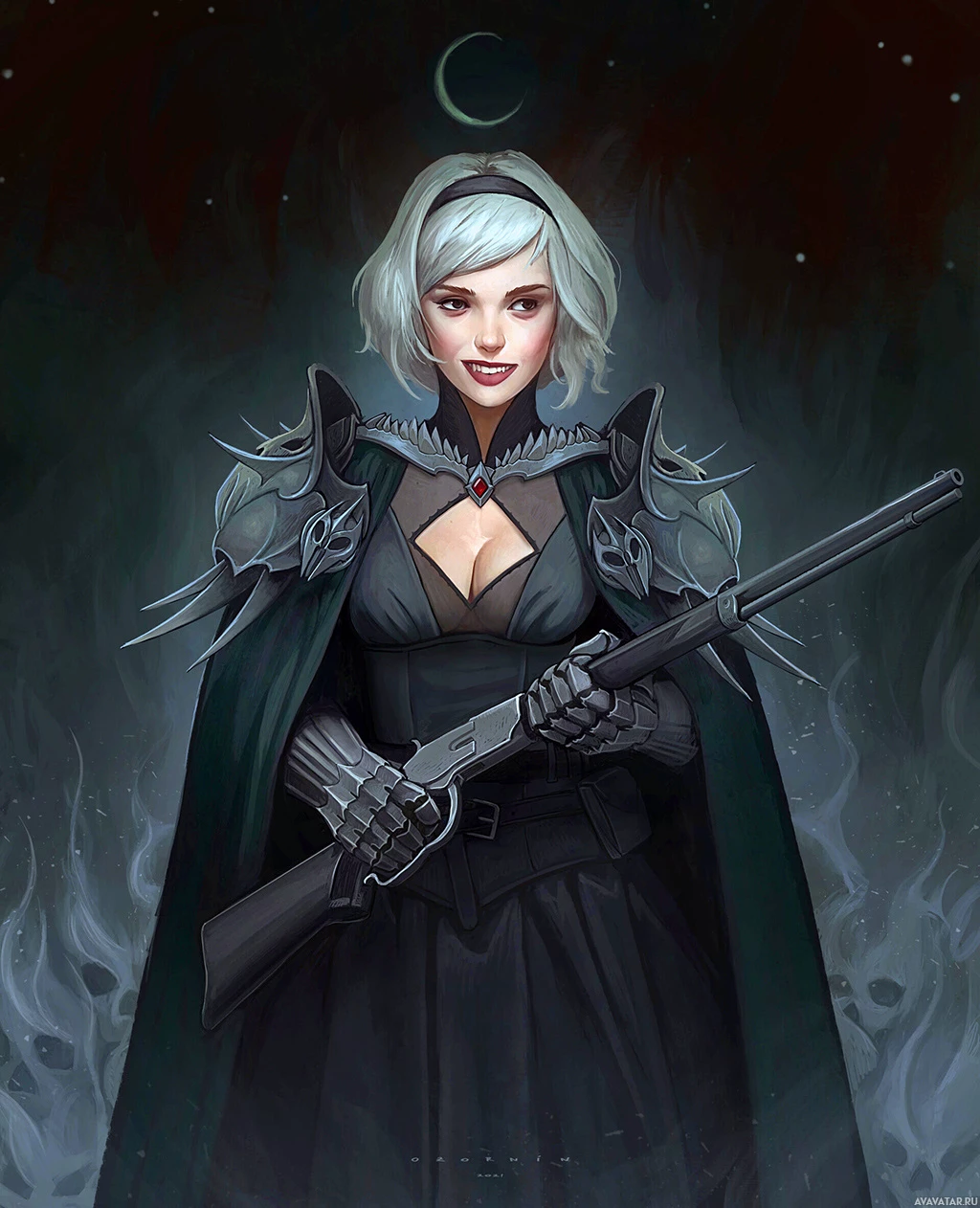 a stern expression and is set against a background that suggests a dark or ominous setting, possibly suggesting the character's role in a fantasy or gothic genre.