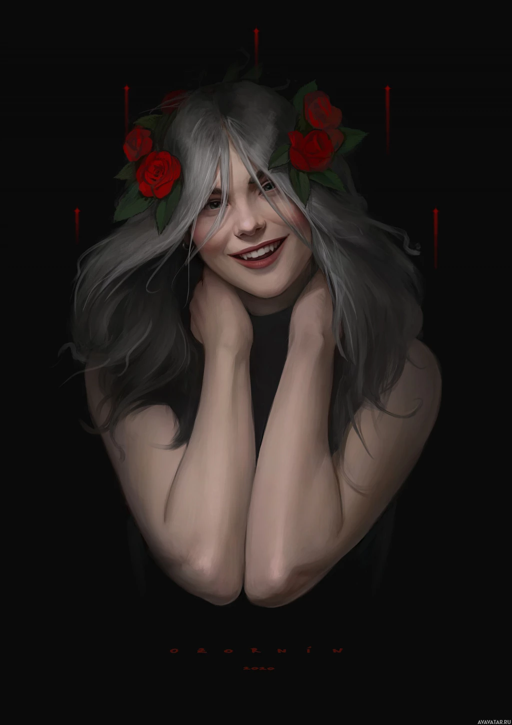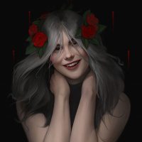 a slight smile and is looking directly at the viewer. The artwork seems to have a dark, possibly noir style, indicated by the monochromatic color scheme and the use of shadows and light to create