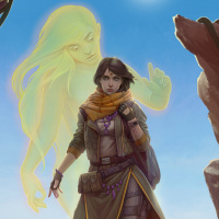 a fantasy setting. In front of her is a figure with a hooded cloak and
