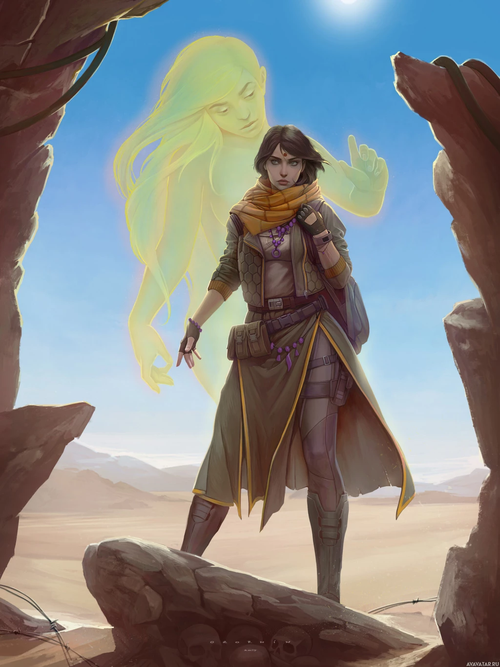 long hair that seems to be blending into the desert's background. The overall atmosphere of the image is one of mystery and possibly supernatural elements, given the ghostly appearance of the figure before the woman.