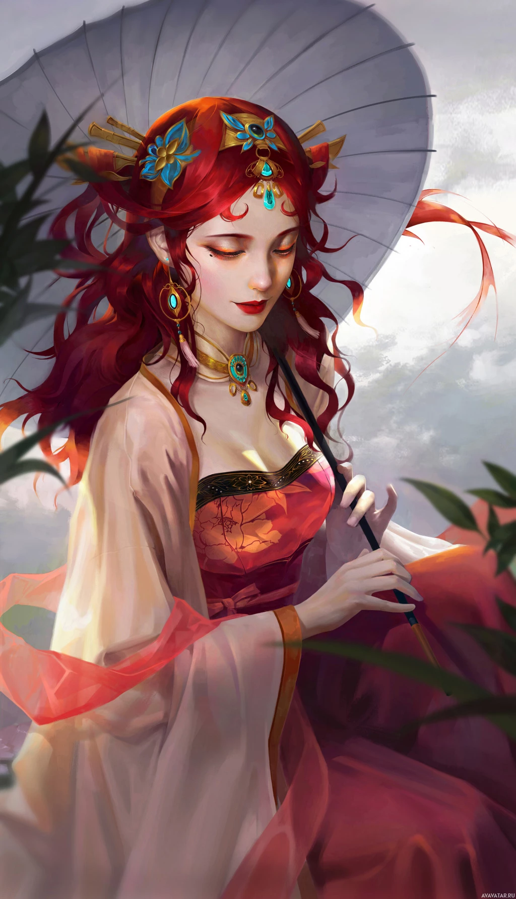 red hair and closed eyes, giving her an ethereal or contemplative appearance. She is holding