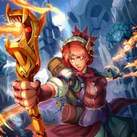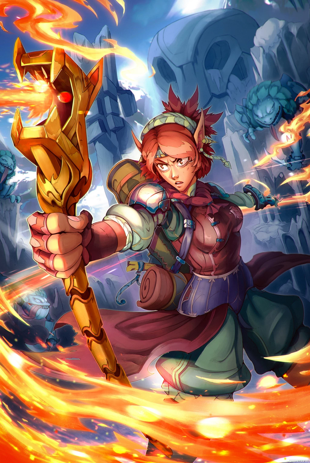 a video game or animated series, given her stylized appearance and the dynamic composition of the artwork. She's holding a staff that seems to be casting