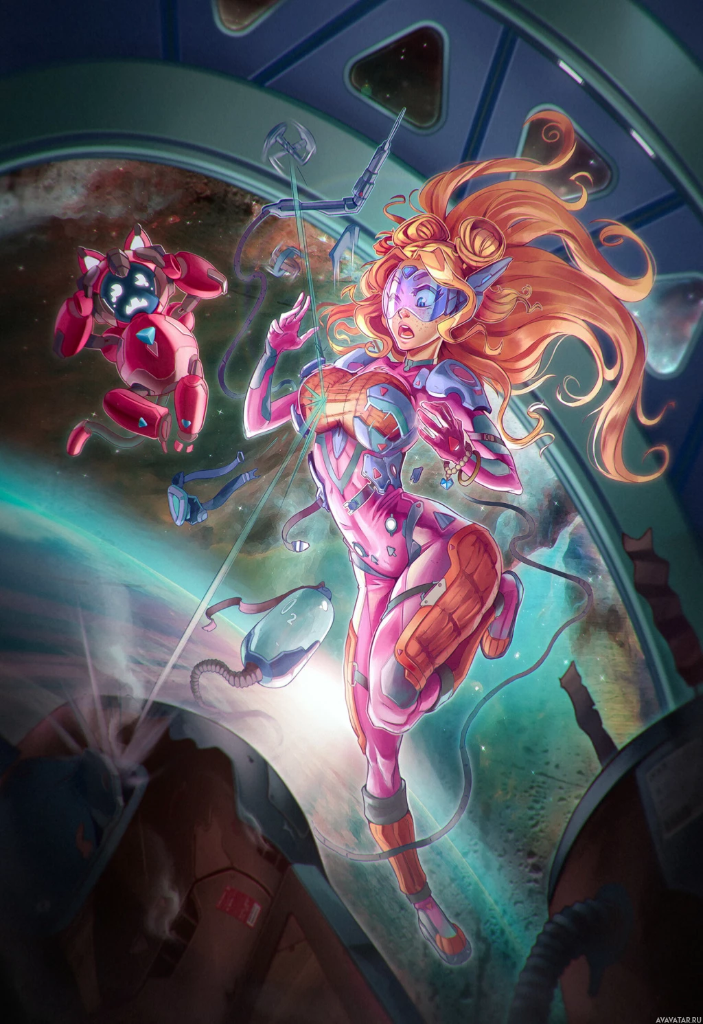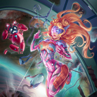space setting, wearing a costume that might suggest she is a character from a comic book or video game. There are various objects and symbols around her, including what seems to be a starship cockpit behind her, a robot to her left, and other cosmic elements that give the image