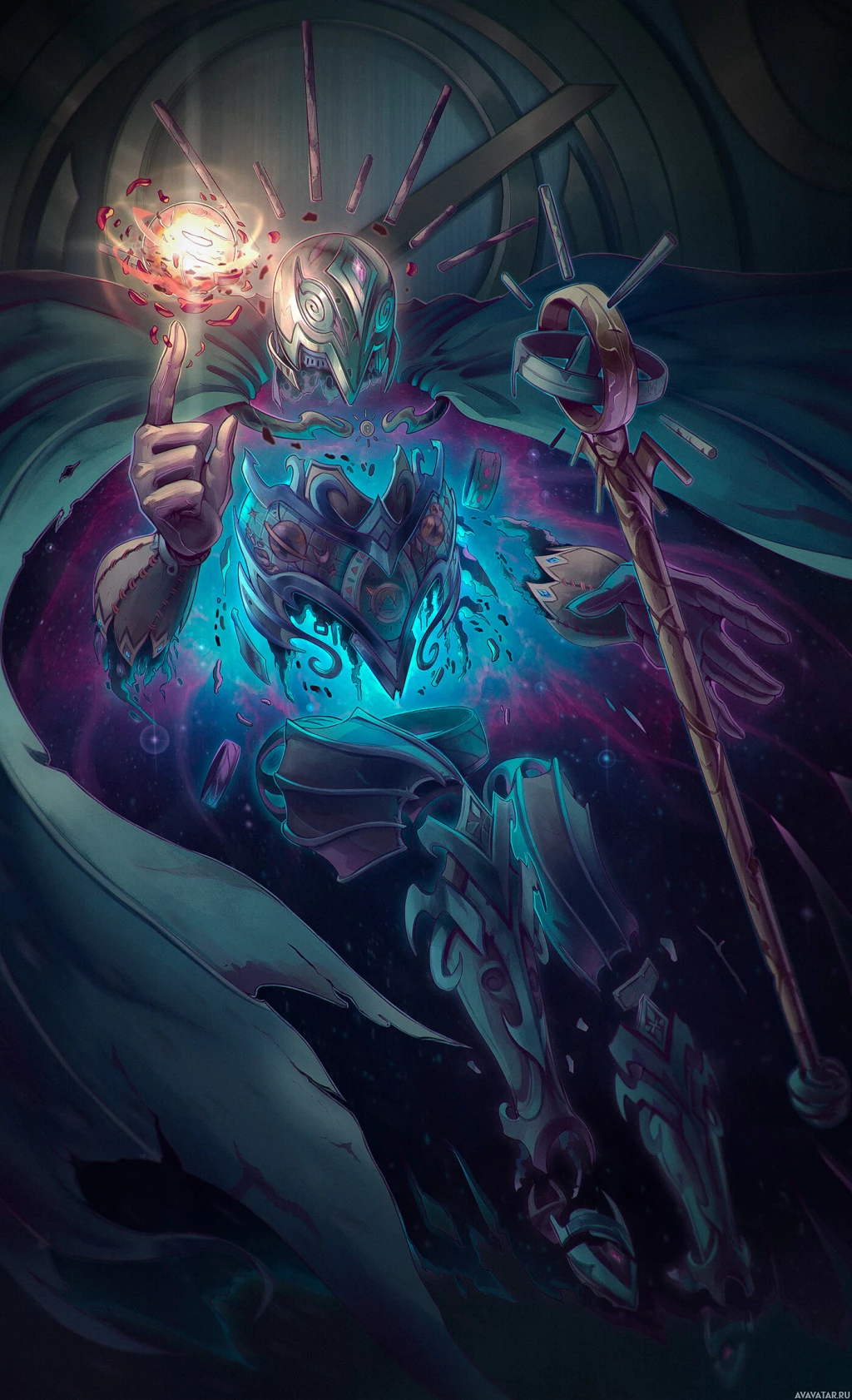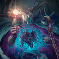 The image shows a fantasy-themed character that appears to be a wizard or sorcerer. The character is holding a staff in one hand and a glowing orb in the other, suggesting they may possess