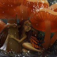 a fantasy scene featuring a fairy-like character sitting amidst a cluster of orange mushrooms. The character appears to be in a contemplative or melancholic state, given her