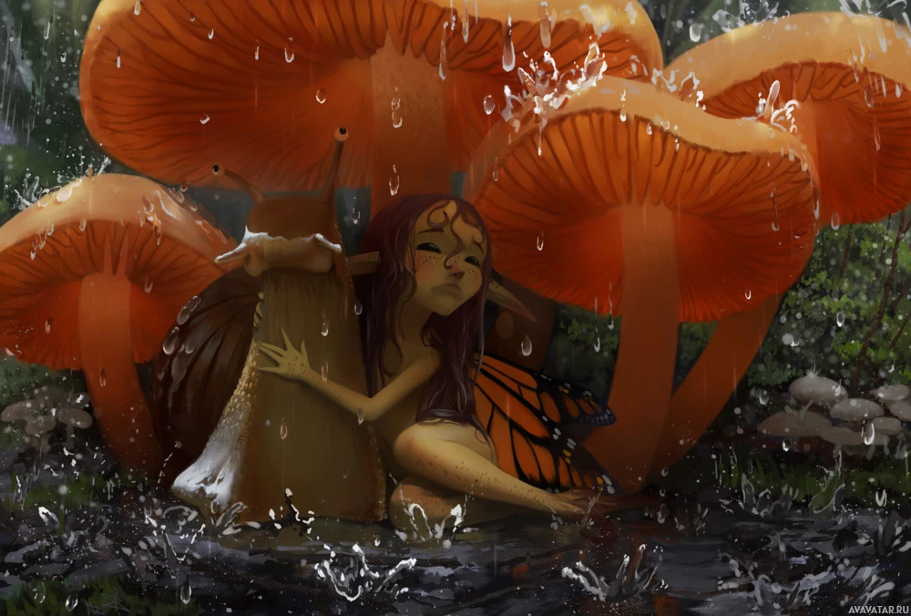 closed eyes and the rain falling around her. The mushrooms are prominent in the picture, with their