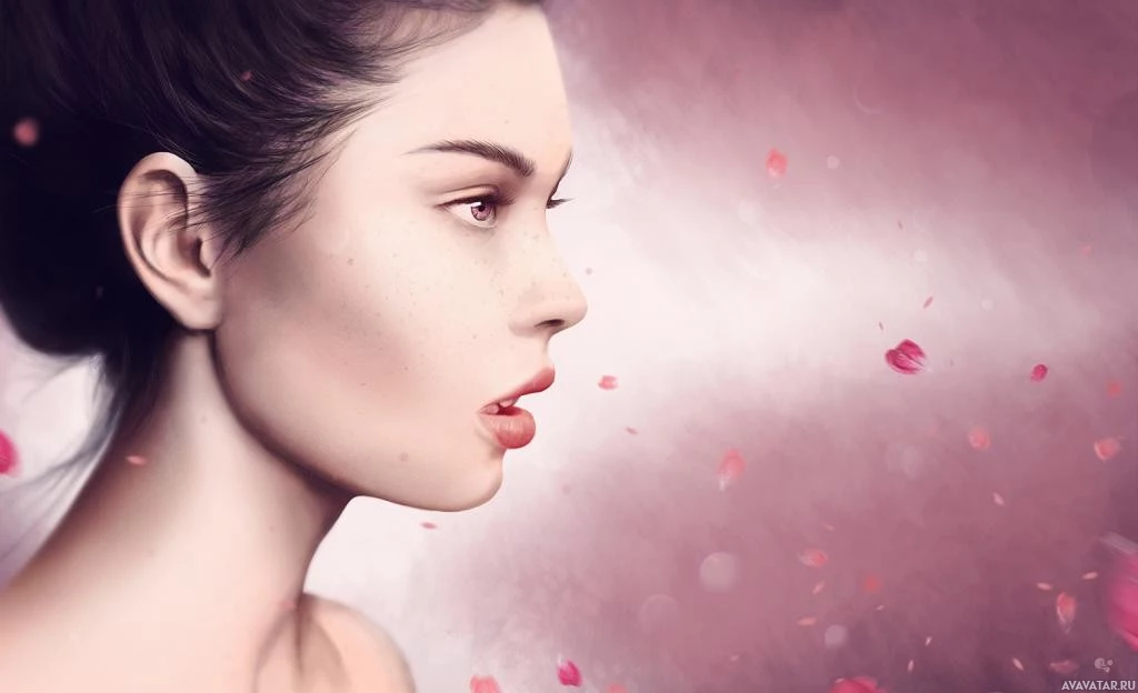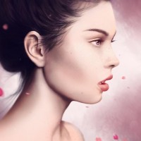 a pinkish hue with what could be hints of petals or rose-like elements floating around her, which adds an ethereal or romantic feel to the image.