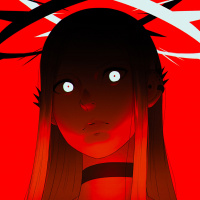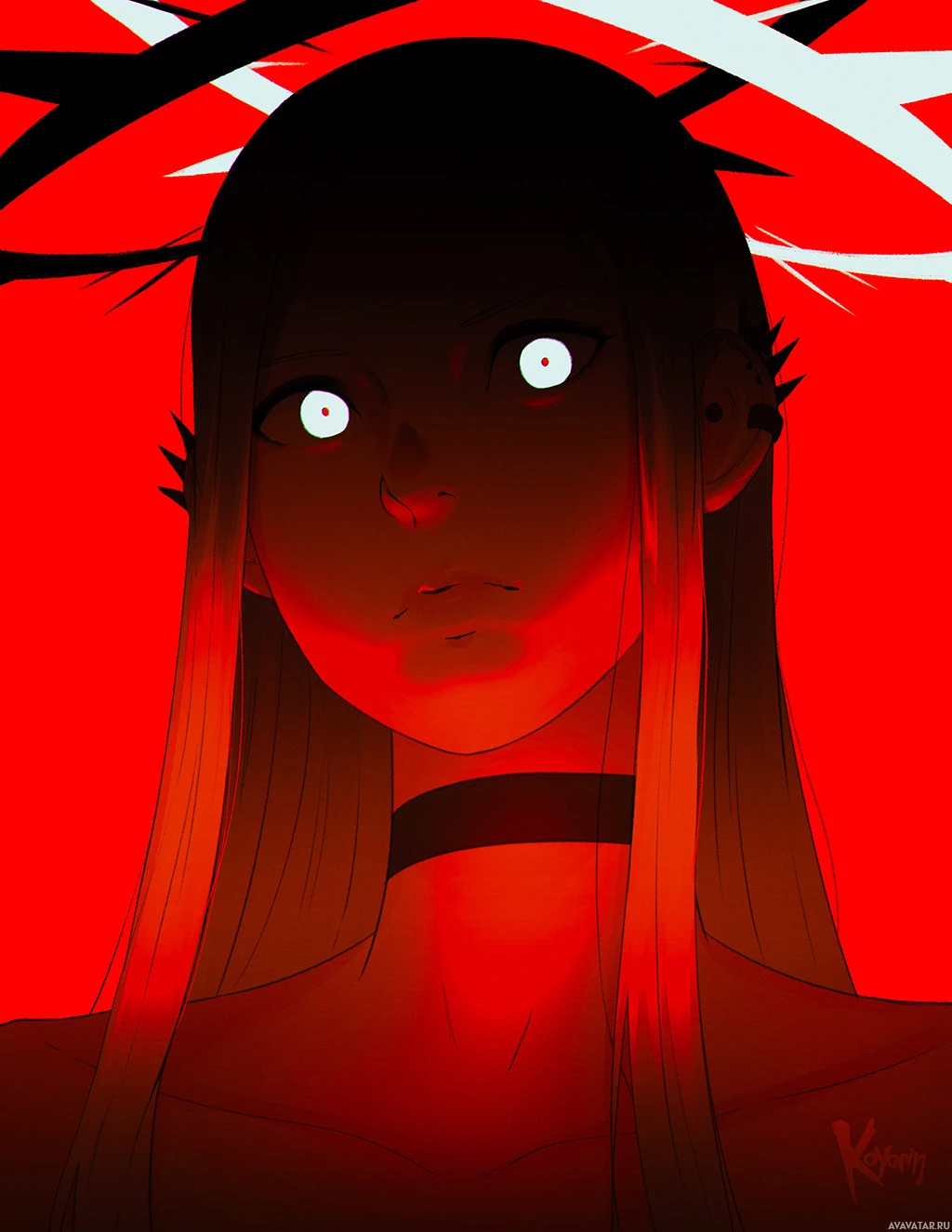blonde hair and a pair of glowing eyes. She appears to be in a contemplative or intense mood, given