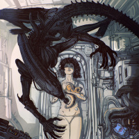 iconic characters from the film series. The Xenomorphs are shown in various postures that suggest they are either attacking or guarding the woman. The background is filled with industrial machinery and panels that indicate a technologically