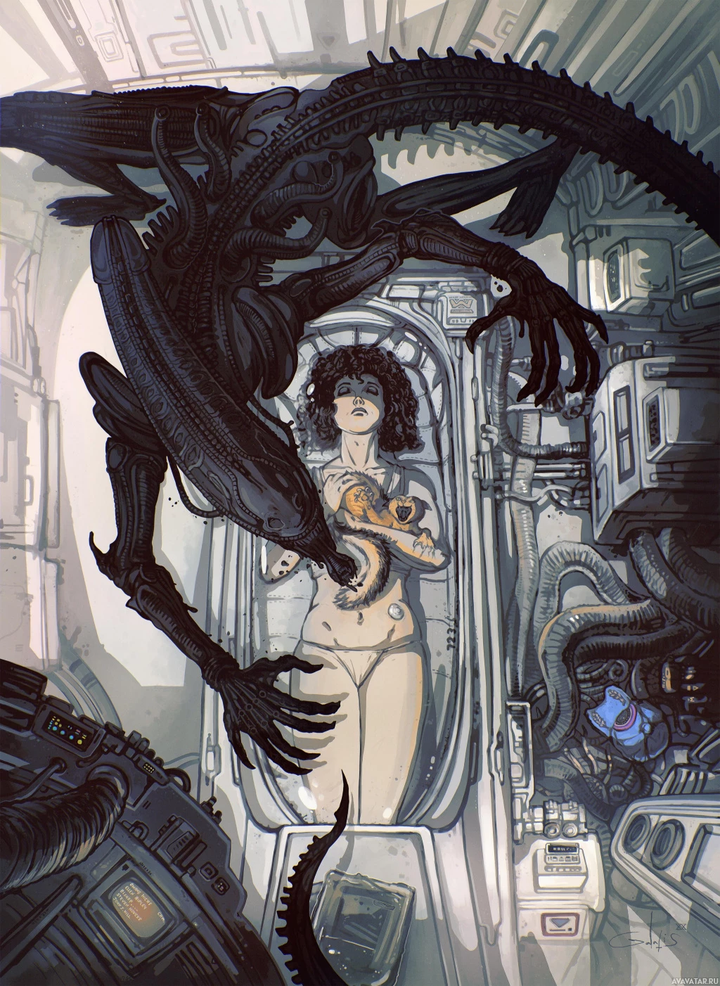 The image depicts a scene from the "Aliens" movie. In the center of the image, there is a woman lying down on what appears to be an operating table within a spaceship or similar setting. Surrounding her are several alien creatures known as Xenomorphs, which are