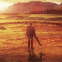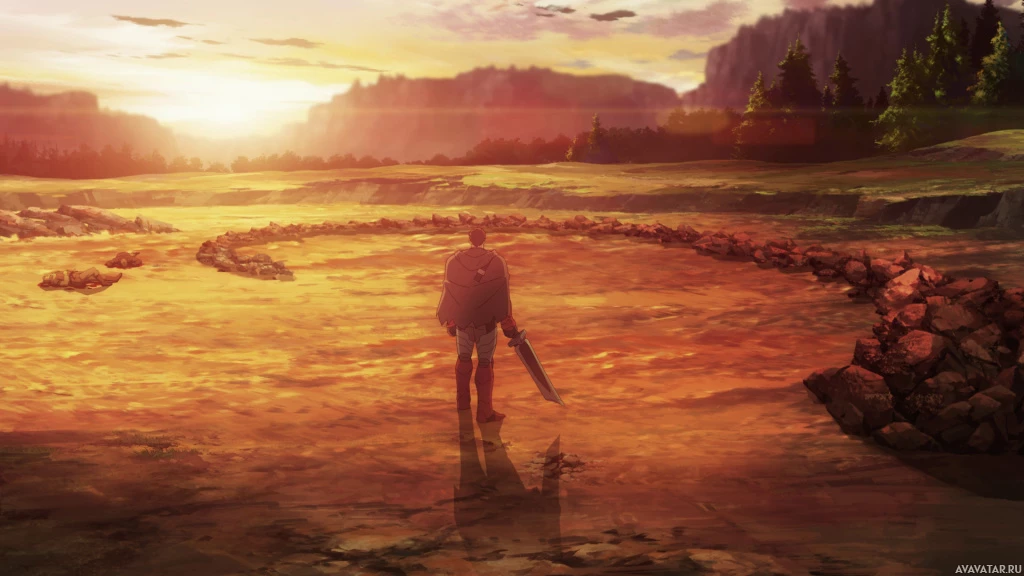 rocky terrain at what appears to be either sunrise or sunset, given the golden light illuminating the scene. Behind the character, there's