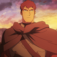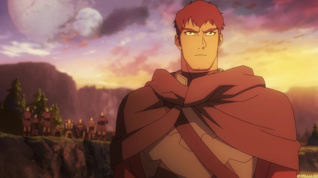 red hair and is wearing armor with a cloak draped over it. The background suggests the setting could be at sunrise or sunset, as there are