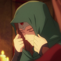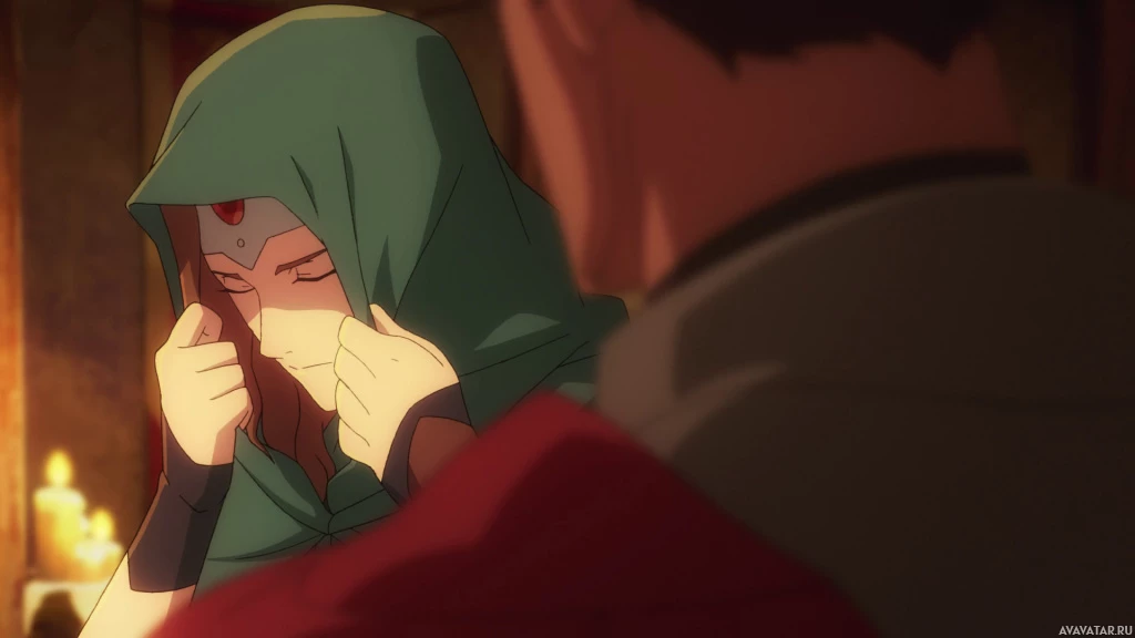 На картинке изображены два анимированных персонажа. Один персонаж одет в зеленый капюшон и, похоже, находится в подавленном состоянии, прикрывая рот руками, как будто плачет или расстроен. У другого персонажа суровое выражение лица, и, похоже, он успокаивает первого персонажа, придерживая его сзади. Эта сцена может представлять собой эмоциональный момент между персонажами.