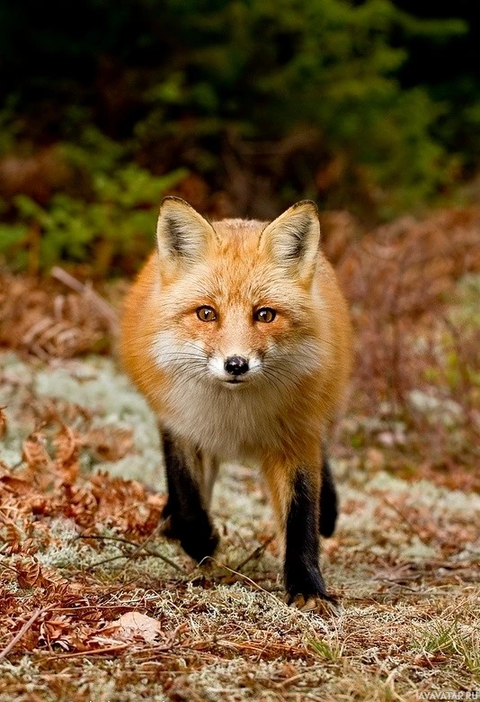 На картине изображена лиса, идущая по природному ландшафту. Лиса имеет красновато-коричневый мех и смотрит прямо в камеру, создавая впечатление бдительности. На заднем плане показана смесь растительности, вероятно, в лесу или лесной местности.