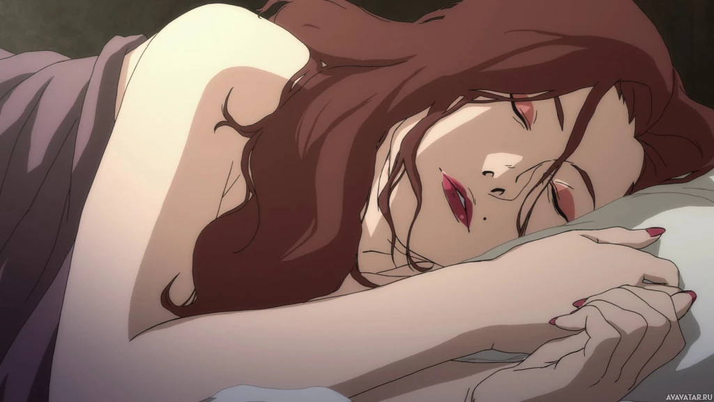 red hair. She appears to be lying down and asleep. Her eyes are closed, and her hands are relaxed on her cheek or pillow. The setting seems to be indoors, likely in a bedroom, and there's