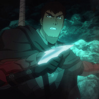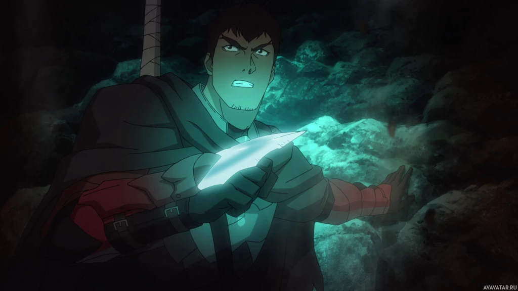 На картинке изображен анимированный персонаж, похожий на рыцаря или воина. Персонаж вооружен мечом и имеет решительное выражение лица. Кажется, что он находится в окружении, которое может быть полем битвы или подземельем, о чем свидетельствуют скалистые стены и то, что выглядит как магические светящиеся эффекты вокруг него.