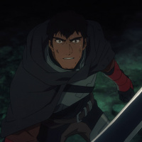 The image shows a character that appears to be from an animated series or movie, depicted in a serious expression. The character is wearing armor with a cloak draped over it and is holding what looks like a large sword. The setting seems to be dark or dimly lit, which adds a dramatic atmosphere to the scene.