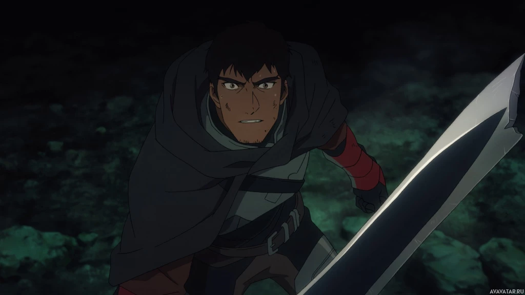 На картинке изображен персонаж, похожий на персонажа из мультсериала или фильма, изображенный с серьезным выражением лица. Персонаж одет в доспехи, накинутые поверх плаща, и держит что-то похожее на большой меч. Обстановка кажется темной или слабо освещенной, что придает сцене драматическую атмосферу.