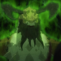 The image shows an animated scene featuring a large, menacing creature with glowing green eyes and what appears to be horns or ears. It's sitting in a darkened environment that looks like it could be inside a cave or underground lair. The style of the animation suggests this might be from an anime series or film.
