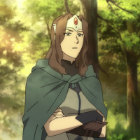 brown hair with a blue mark on her forehead. It appears to be from the anime "