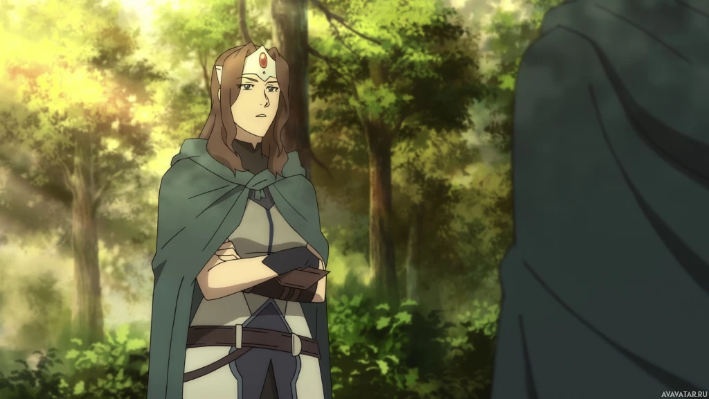 an animated character standing in a forest setting. The character is wearing a cloak and has