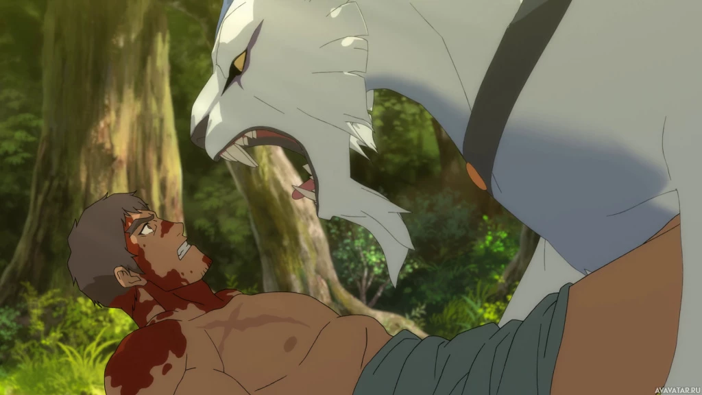 signs of distress on both characters' bodies, such as cuts or bruises, suggesting they have been engaged in a violent encounter. The setting looks like