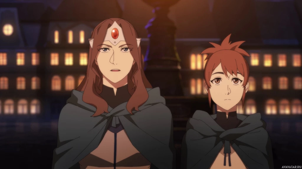 mythical creature, while the other looks more like a human with an unusual hairstyle that covers her ears. Both characters are depicted wearing cloaks, which suggests a setting in a medieval or fantasy universe. The background features what seems to be a dimly lit