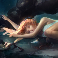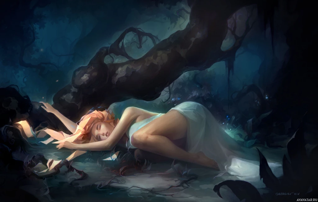 The image depicts a fantasy-style artwork of a red-haired girl with closed eyes. She appears to be sleeping or in a state of rest, surrounded by a natural setting that resembles a forest at night. The lighting and color palette create an ethereal and dreamlike atmosphere, enhancing the sense of tranquility and peacefulness.