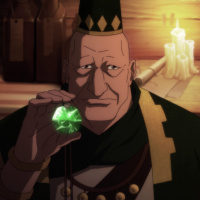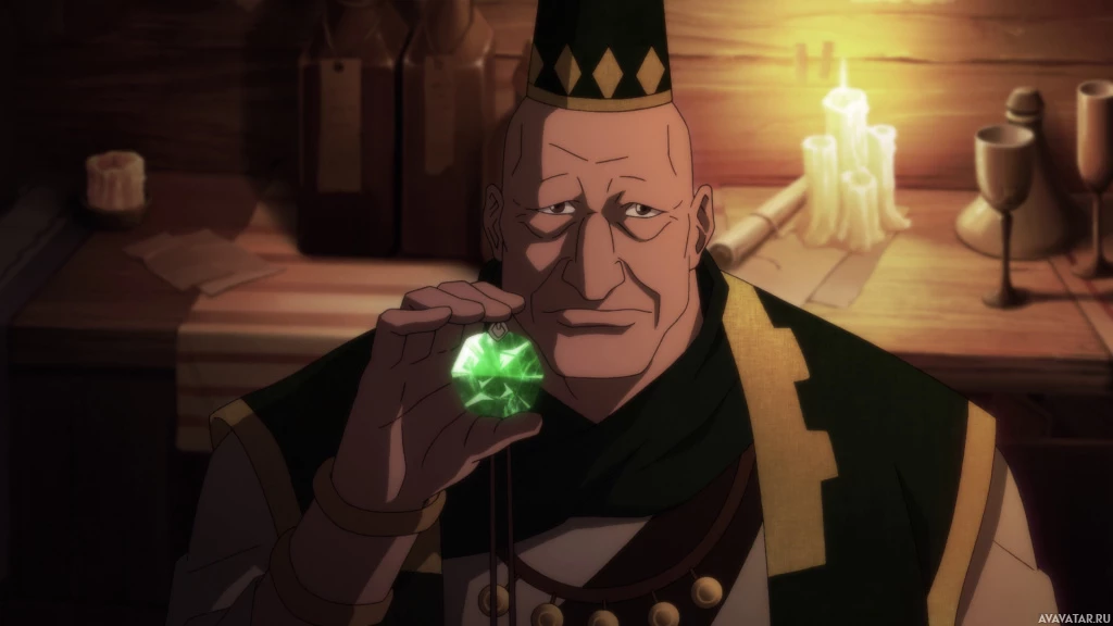 an interior space that could be part of a shop or workshop, given the tools and materials visible in the background. The character's attire suggests he might have some sort of expertise related to gems or