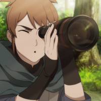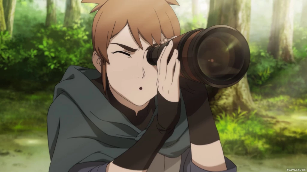 На картинке изображен анимационный персонаж, который, похоже, делает снимок. У персонажа светло-каштановые волосы, и он одет в нечто вроде куртки с поднятым капюшоном, что позволяет предположить, что он находится на холоде или на открытом воздухе. На заднем плане видны размытые элементы, которые кажутся естественными пейзажами, возможно, деревьями, указывающими на то, что они находятся на открытом воздухе.