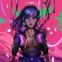 the futuristic clothing and gadgets such as a headset and what appears to be a weapon or tool on her back. The background features a vibrant, almost psychedelic design with pink hues, suggesting a neon-