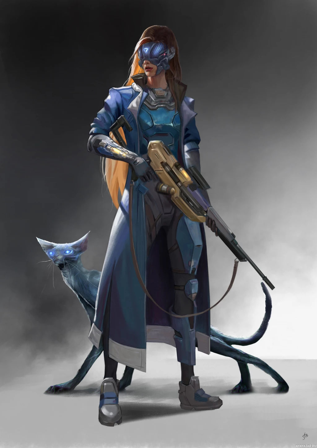a large gun slung over her shoulder, suggesting she may be in a combat or action role. At her feet is a humanoid robotic dog-like creature, which adds to