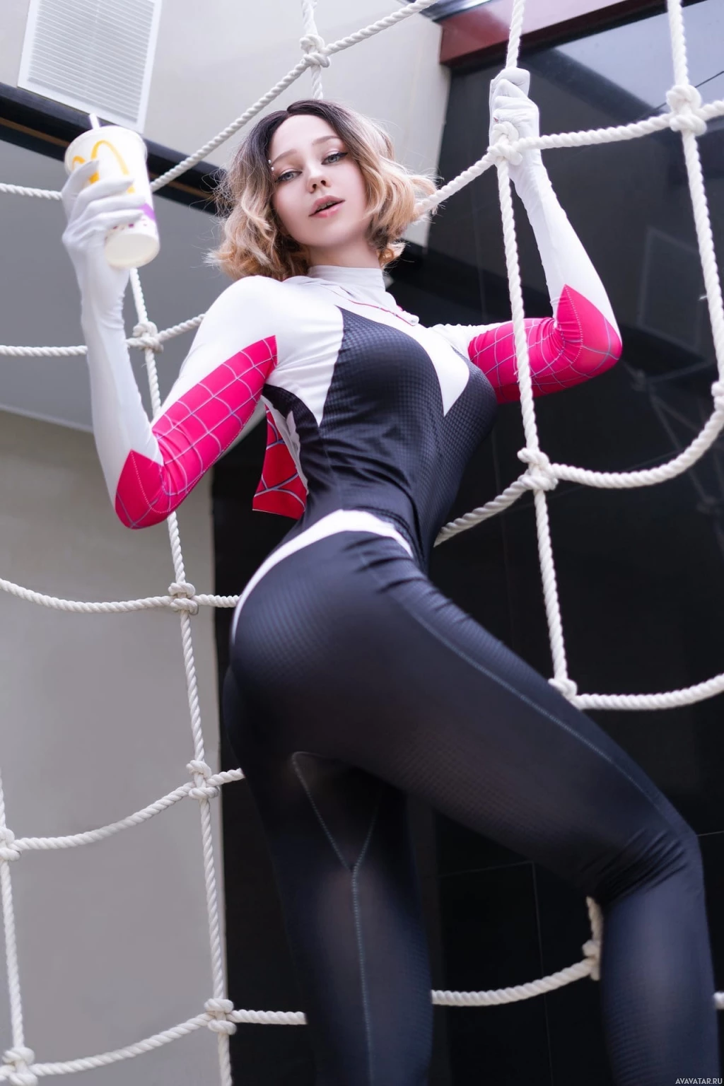 Gwen Stacy from Marvel Comics. This individual is wearing a bodysuit with a design that matches the iconic red and black suit worn by Spider-Gwen, which is an alternate universe