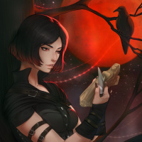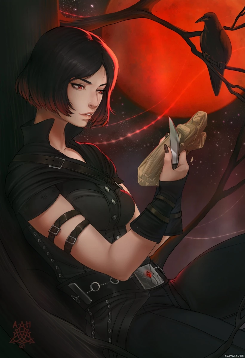 a fantasy setting. A bird is also present in the scene, perched near her on the same branch. The background includes silhouettes of what look like trees and a red moon or