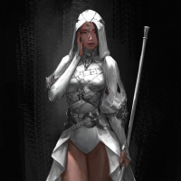a hooded cloak, suggesting she might be a mystical or legendary figure. The design elements and the style of the artwork give it a high-fantasy or historical feel.