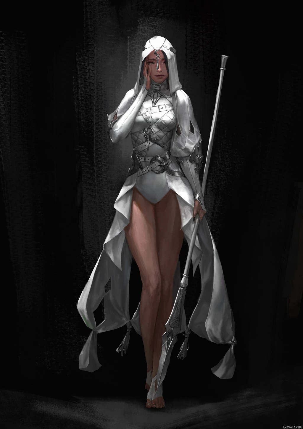The image shows a character designed as a warrior or fantasy heroine. She is wearing armor and has