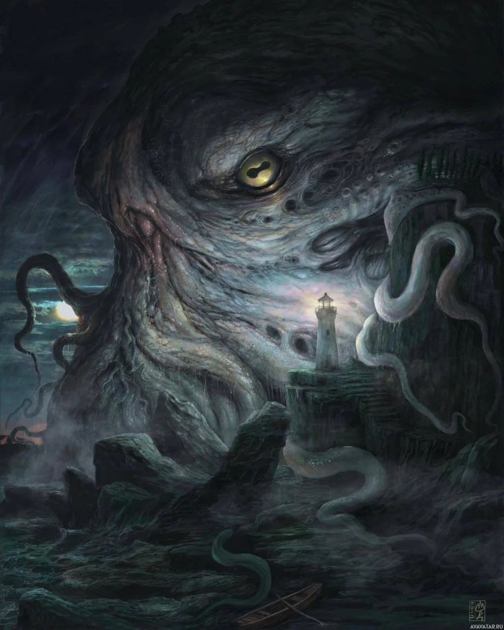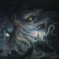 stormy sky with a lighthouse in the distance, adding to the sense of danger and mystery typically associated with Lovecraft's cosmic horror genre. The overall atmosphere of the image is eerie and atmospheric, fitting within the fantasy theme as well as